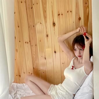 她穿着白色吊带背心和短裤,娇媚可爱,有种居家休闲感,纯欲风拿捏得刚好。